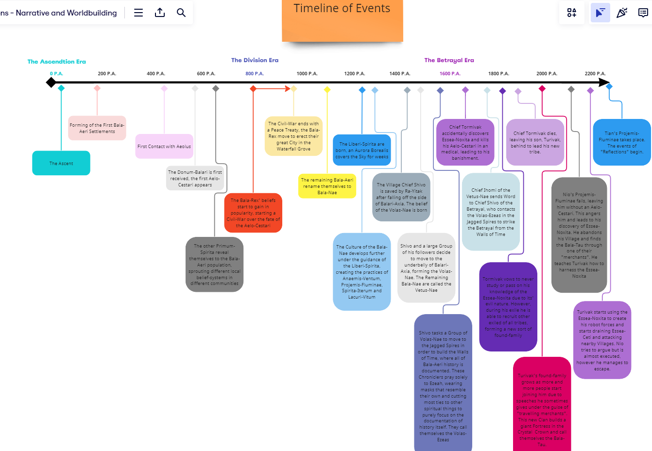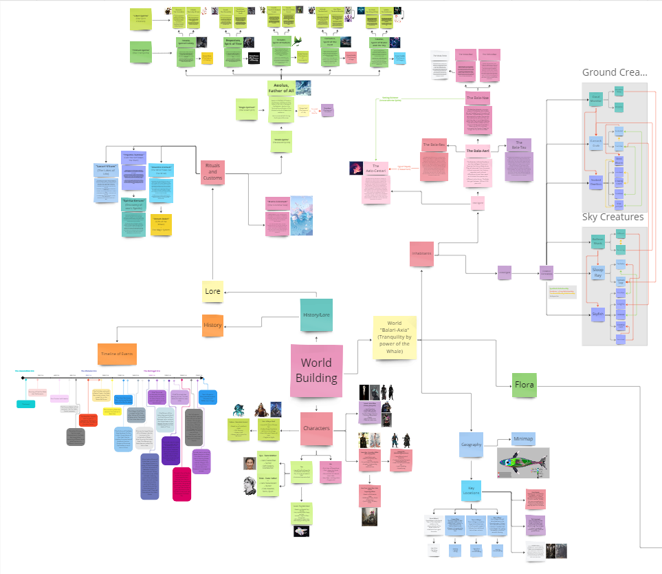 I developed an ecosystem of animals and plants, each unique to their specific biomes. I created different tribes and civilizations each with their own cities, rites and cultures. I even developed a language for them, which would later mostly be found in lore-codexes.