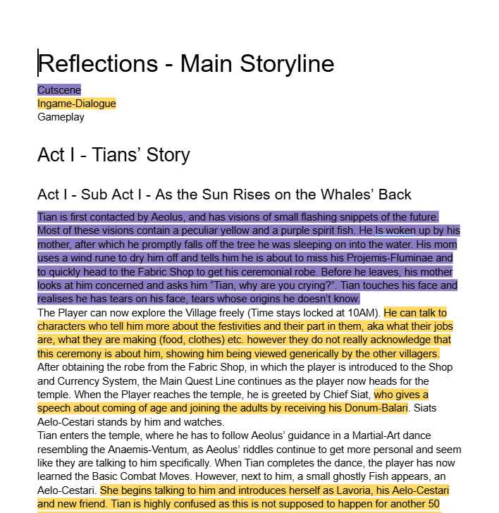 Since we had plans to one day make Reflections into a full game, I wrote a first draft of the overarching story of the game in the form of cutscenes, dialogue and more. This included writing the script for the first cutscene in the game, "Projemis-Fluminae", which was later actually animated for the prototype we made.