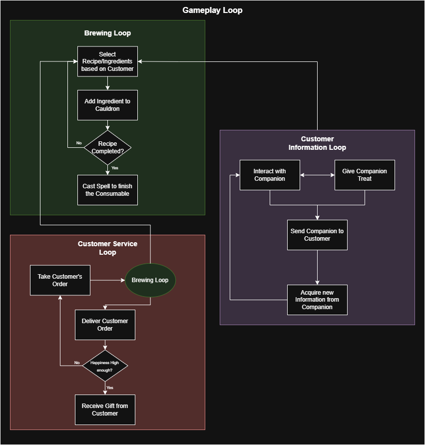 Game Design was something I was relatively new to at that point, so I was happy to try something new. I designed the mechanics of the game, including the Brewing, Gathering of Customer Information and the Core Gameplay Loop.